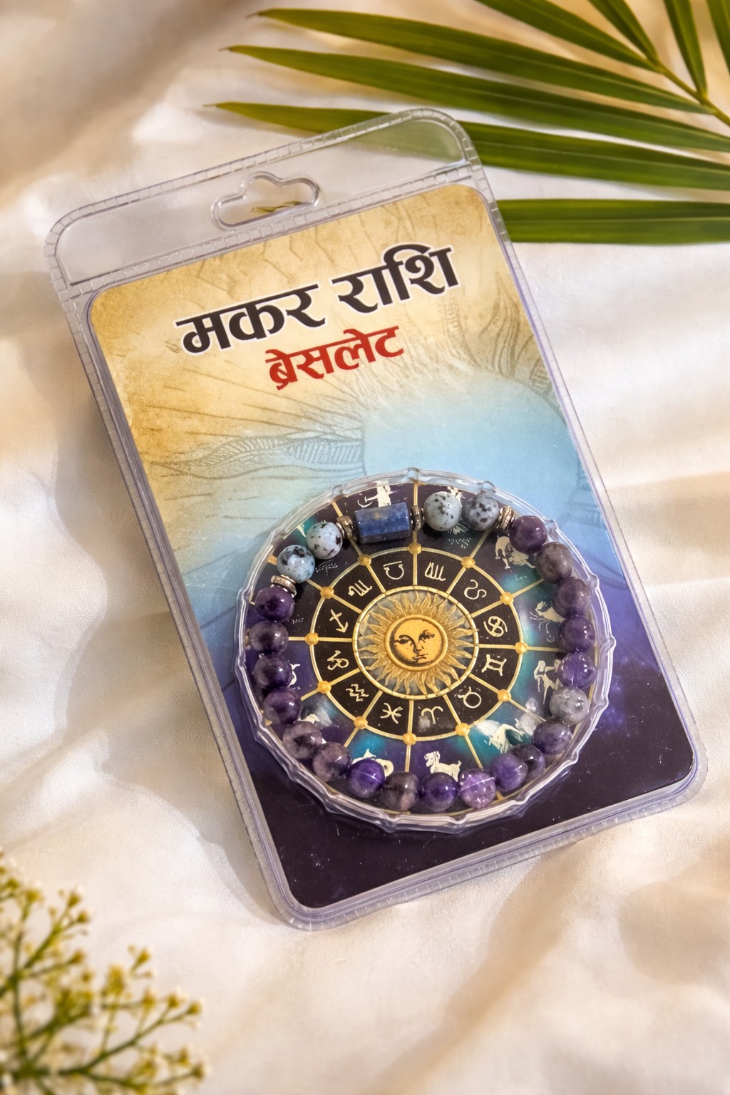 The AstroAura Capricorn Zodiac Bracelet is a powerful piece of jewelry designed to support the wearer's astrological alignment. Crafted from genuine Amethyst and Lapis Lazuli crystals, this bracelet taps into the energies needed by a Capricorn (Makar Rashi) individual. The stretchable design ensures easy wearing, making it a thoughtful and meaningful gift option for birthdays or festive occasions.