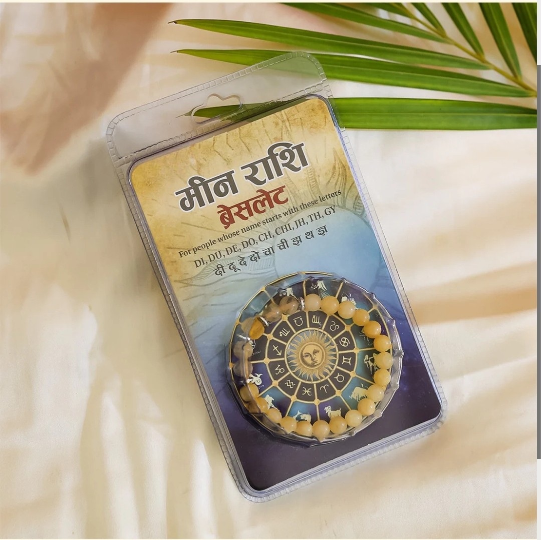 The Cosmic Harmony Meen Rashi Bracelet is a unique blend of style and spirituality. Designed specifically for those under the Pisces zodiac sign, this elastic bracelet features smooth yellow stone beads and a striking central charm depicting the solar zodiac. It’s an essential accessory for anyone looking to carry their lucky sign and corresponding positive energy wherever they go. Lightweight and durable, it is perfect for everyday use.